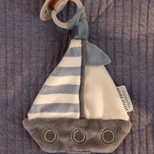 Comfort is coming. Opt for this captivating pacifier cloth and you’ll have your baby’s soother always within reach. It makes for a great maternity gift too. Attach a teether or pacifier to the blue-hued cotton loop to keep it clean and close by. Shaped into a little boat, it doubles as a fun cuddle toy to play and snuggle up with at bedtime. Pair with our matching Sailors Bay products for a coordinated nursery.