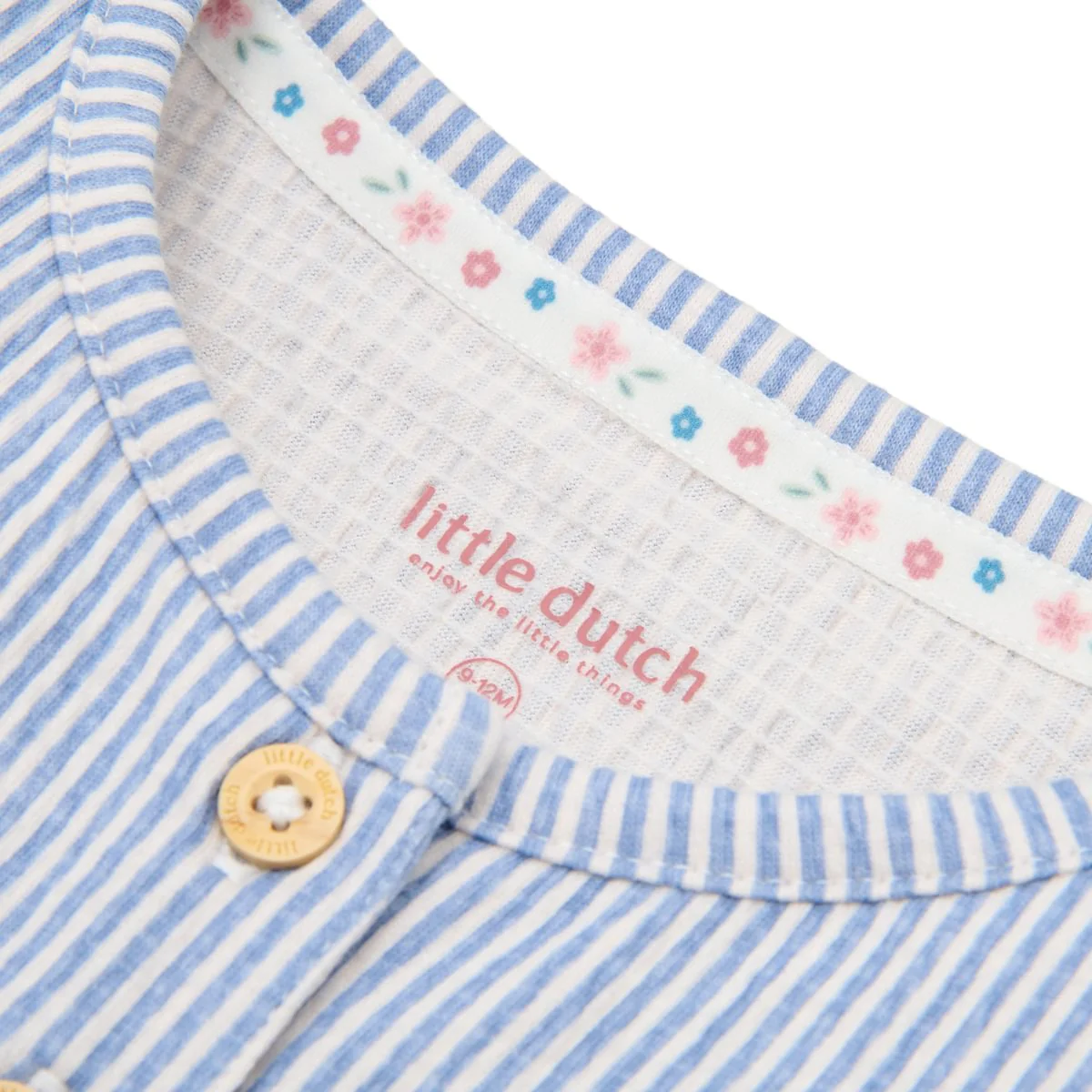 Playful, comfortable and ready for sunny days. This short dungarees in Denim Blue Stripe is made from a soft crinkle fabric with stretch. The fine stripe gives it a fresh and timeless look. The ruffles over the shoulders add a cheerful touch, while the elastic waistband and front button closure make dressing easy. Made of organic cotton and Oeko-Tex certified â a safe and conscious choice for every day. A complete little outfit for days full of play, discovery and joyful moments.