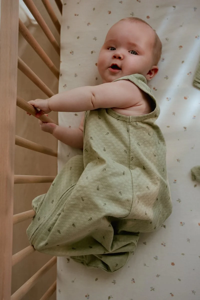 In this sleeping bag in the beautiful Pure Sage colour with subtle leaf print and a fine embroidery on the chest, your little one sleeps stylishly and comfortably. Made of luxurious, soft jersey jacquard fabric, it feels like your baby is wrapped in a cloud – but without the tickle. Perfect for a good night's sleep, both for your baby and for you! The sleeping bag closes downwards so that your child cannot easily open the sleeping bag himself. There is a flap over the zipper, so that the sensitive baby skin remains protected. The sleeping bag is available in 70 cm and 90 cm.